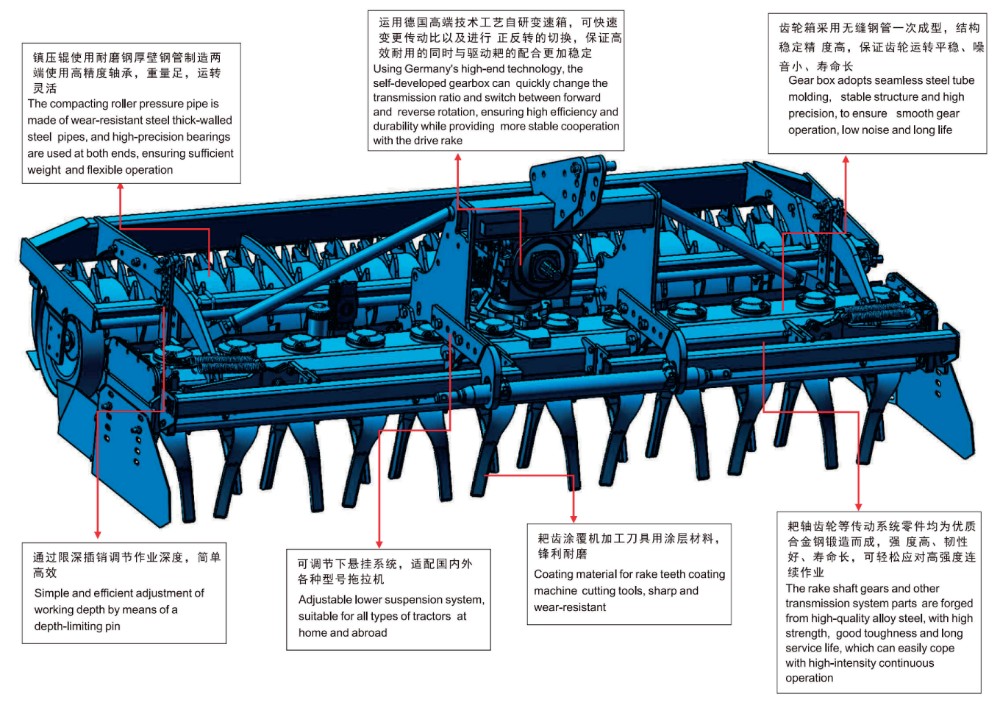 ? 高速變速箱可調(diào)整轉(zhuǎn)速比改變耙齒轉(zhuǎn)速,可靠耐用,可承載大馬力拖拉機(jī)扭矩輸出。